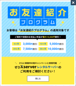 ※余談ですが、私はxserverを利用しています。仕事でも約10年近くお世話になっていますが、トラブルの記憶がありません。現在、キャンペーン実施中で、お友達キャンペーン実施中こちらをクリックすると契約に応じて3,000円~最大10,000円初回支払いが割引されます(紹介者の私にも支払いがあり、とても嬉しいです)。ぜひご活用ください。